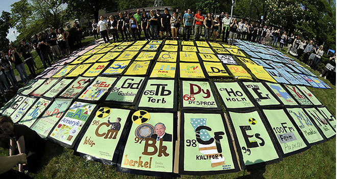 Największy układ okresowy pierwiastków? Dla studentów Wydziału Chemii Uniwersytetu Jagiellońskiego to przysłowiowa „pestka”! Dziesiątego maja 2018 roku narysowali na krakowskim Rynku największą tablicę Mendejewa o powierzchni 4500 m². W ustanowieniu Rekordu Polski Pomagało ponad dwieście osób: władze uczelni, studenci i uczniowie ze współpracujących z UJ szkół, którzy przez kilka godzin rysowali układ pierwiastków.
