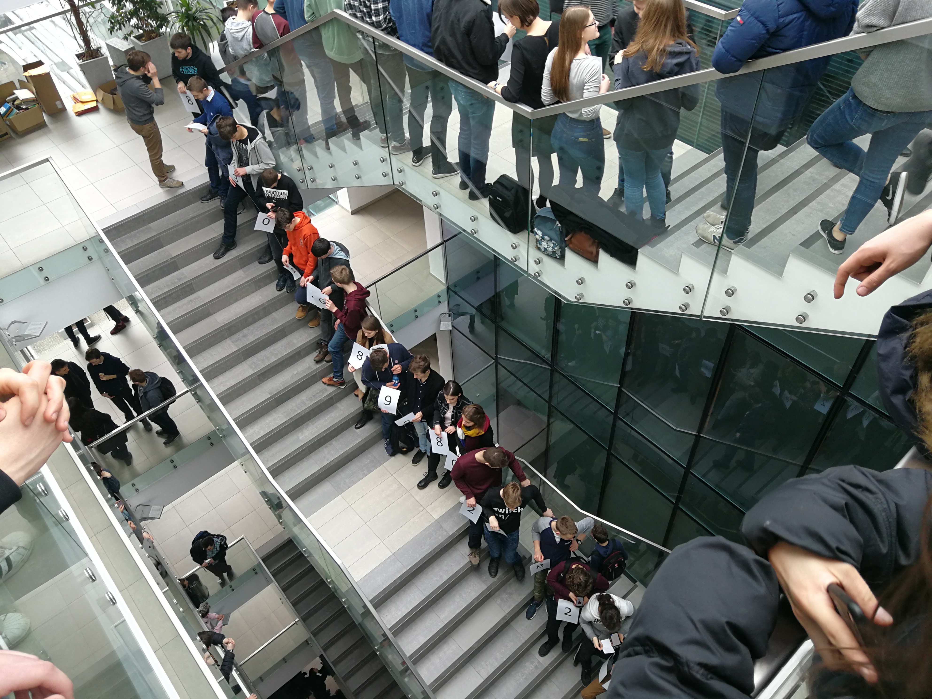 Każdego roku, w dniu 14 marca obchodzimy Dzień Liczby Π (Pi), to właśnie w tym dniu w 2019 roku został pobity Rekord Polski w najdłuższym rozwinięciu tej liczby. To osobliwe święto obchodzimy 14 marca, ponieważ datę tę w notacji amerykańskiej, odwrotnie niż w europie zapisuje się jako 3.14 – są to pierwsze liczby rozszerzenia dziesiętnego liczby pi. Jako że święto obchodzone jest przede wszystkim kręgach szkolnych i akademickich zwłaszcza na wydziałach matematyki, fizyki czy informatyki, Certyfikat Rekordu Polski musiał trafić do studentów Politechniki Warszawskiej! Finalnie do zabawy przyłączyły się 393 osoby, co zaowocowało rozwinięciem 391 cyfr po przecinku.Ze względu na niezbyt przychylną marcową pogodę bicie Rekordu odbywało się na korytarzach i schodach kampusu Politechniki Warszawskiej przy wsparciu studentów tegoż wydziału i nieocenionej pomocy Pana Rektora oraz wykładowców. Wydarzenie zorganizował Samorząd Studentów Politechniki Warszawskiej.